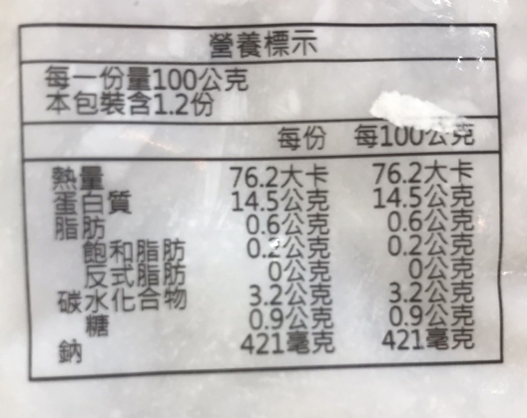 成分:蝦仁、魷魚、馬鈴薯澱粉、糖、L-麩酸鈉、鹽、調味劑 ( 5'-次黃嘌呤核苷磷酸二鈉、5'-烏嘌呤核苷磷酸二鈉 ) 、白胡椒粉、酵母抽出物、品質改良劑 < 多磷酸鈉、焦磷酸鈉(無水) >