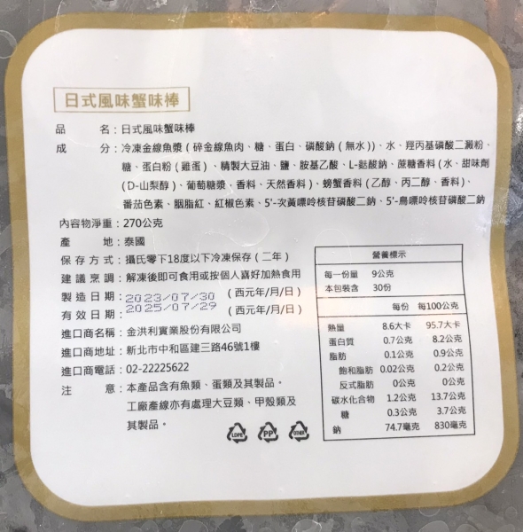 成分:冷凍金線魚漿(碎金線魚肉、糖、蛋白、磷酸鈉(無水))、水、經丙基磷酸二澱粉、糖、蛋白粉(雞蛋)、精製大豆油、鹽、胺乙、-酸鈉蔗糖香料(水甜劑D-山梨醇)、萄漿.香料、天然香料)螃蟹香料(乙、丙醇、香料色素、胭脂、紅椒色素、5-次黃核磷酸二鈉、5'-鳥嘌呤核