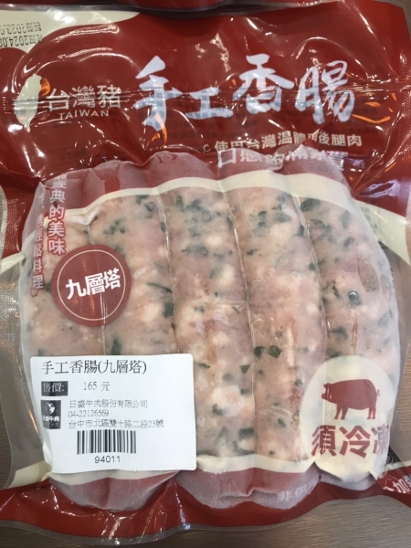 內容物: 豬肉、豬油、天然腸衣、九層塔、糖、鹽、香料、甜味劑(甘草酸鈉、甘草素、調味劑(味精)、抗氣化劑(異抗壞血酸鈉、結著劑(多磷酸鈉、焦磷酸鈉)、保色劑(亞硝酸鈉)、非基因改造(大豆蛋白、玉米澱粉)、食用色素紅色6號