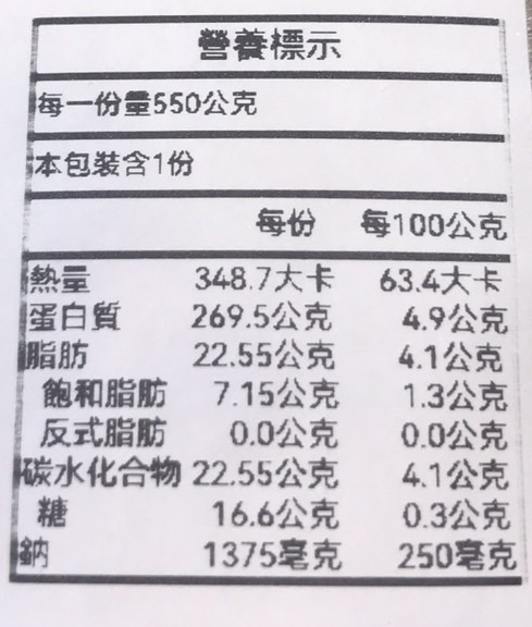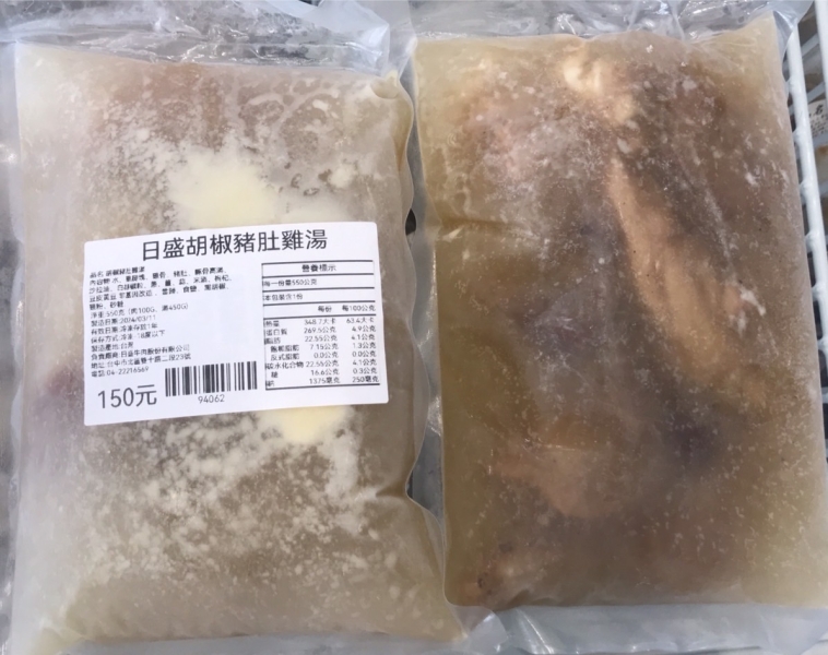 內容物: 水、雞腿塊、雞骨、豬肚、豚骨高湯、沙拉油、白胡椒粒、蔥、薑、蒜、米酒、枸杞、豆皮(非基因改造黃豆)、當歸、食鹽、黑胡椒、雞粉、砂糖
