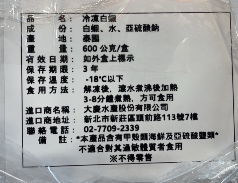 成份: 白蝦、水、亞硫酸鈉